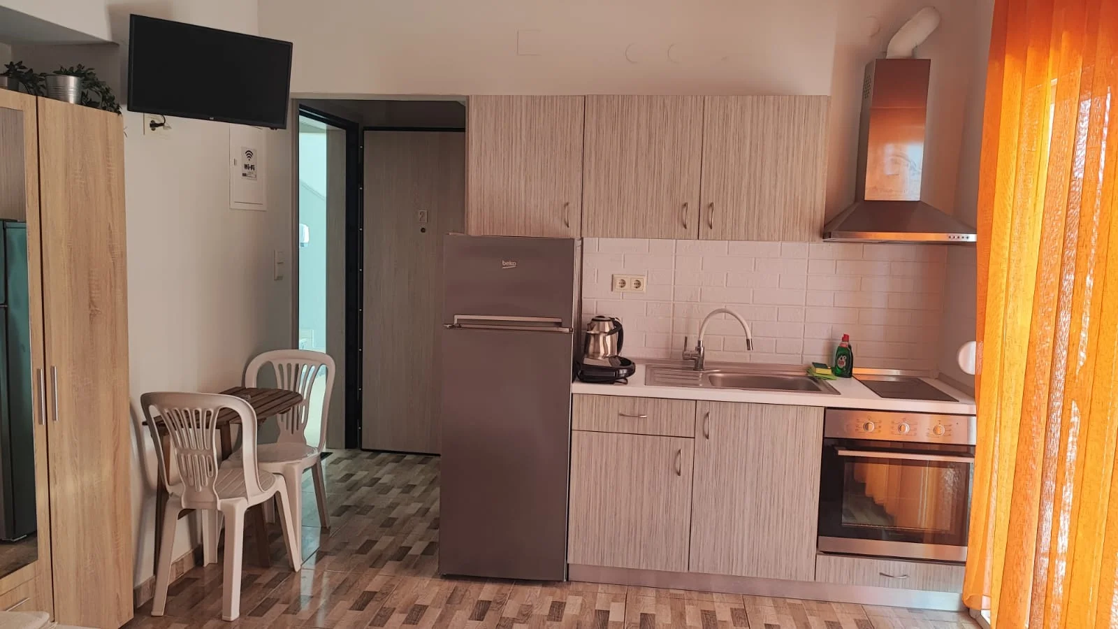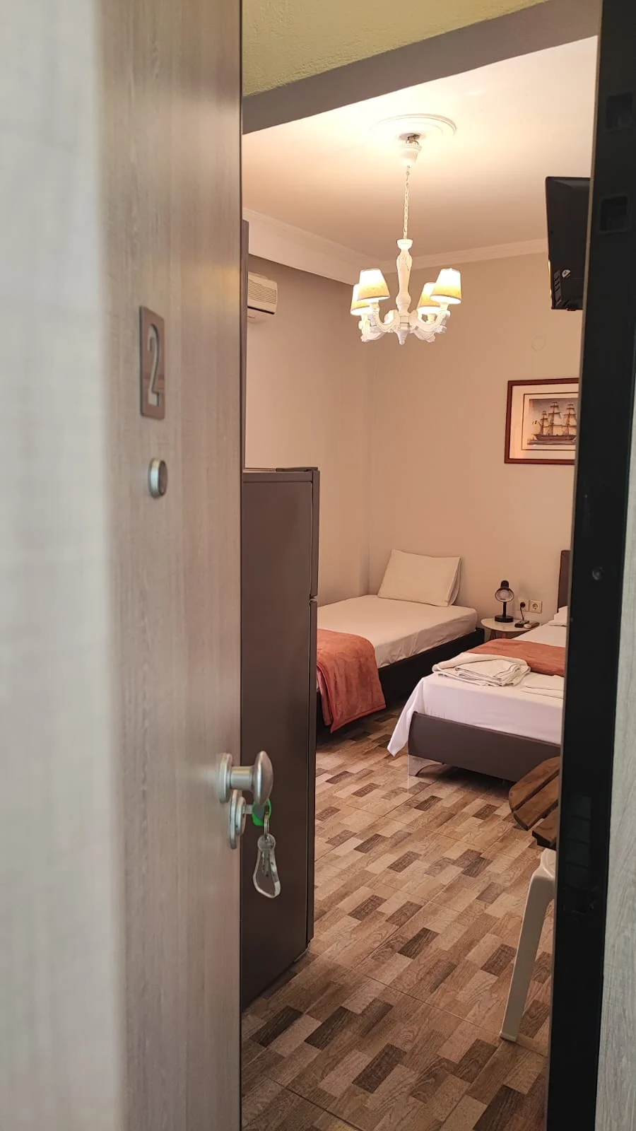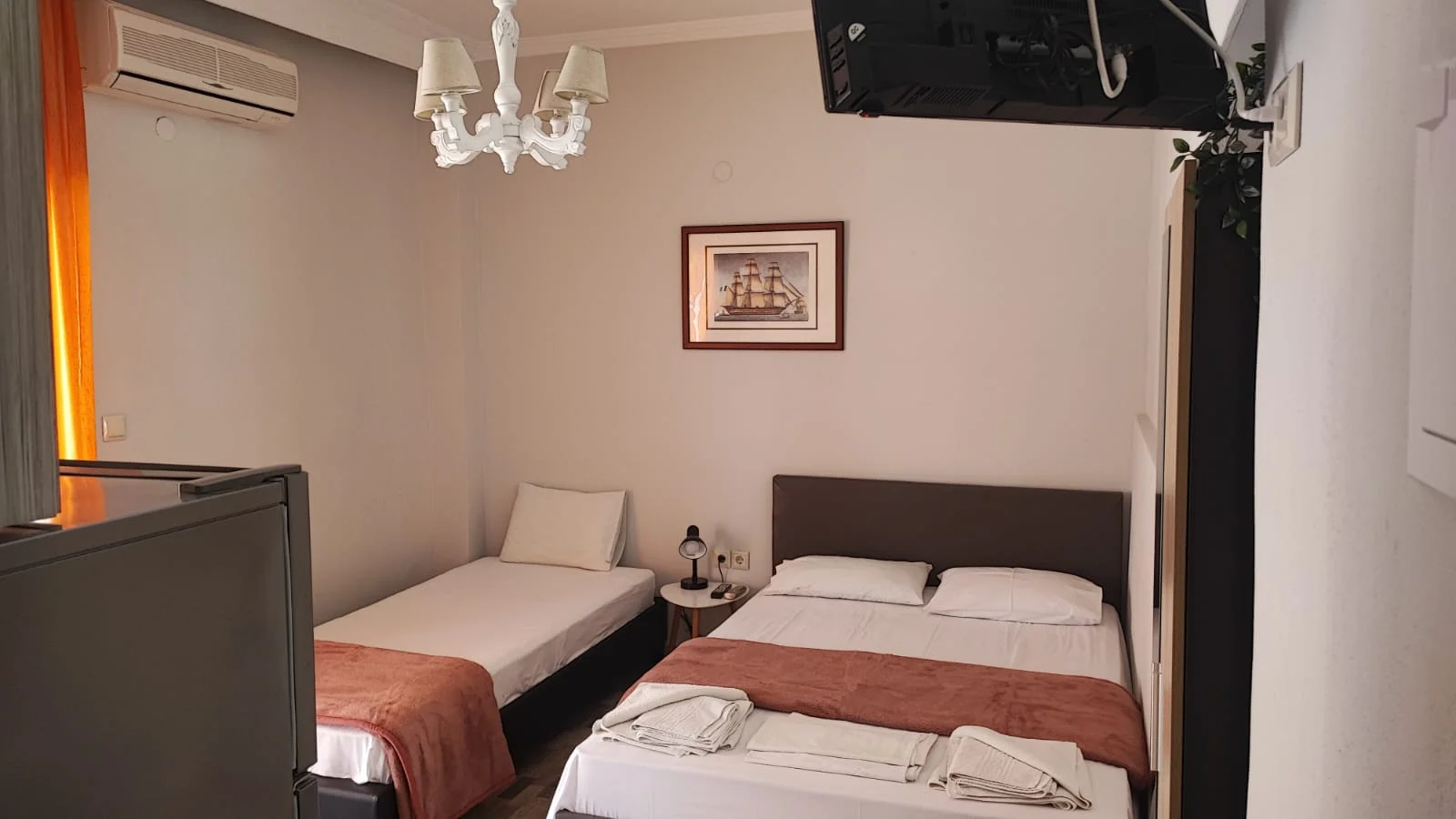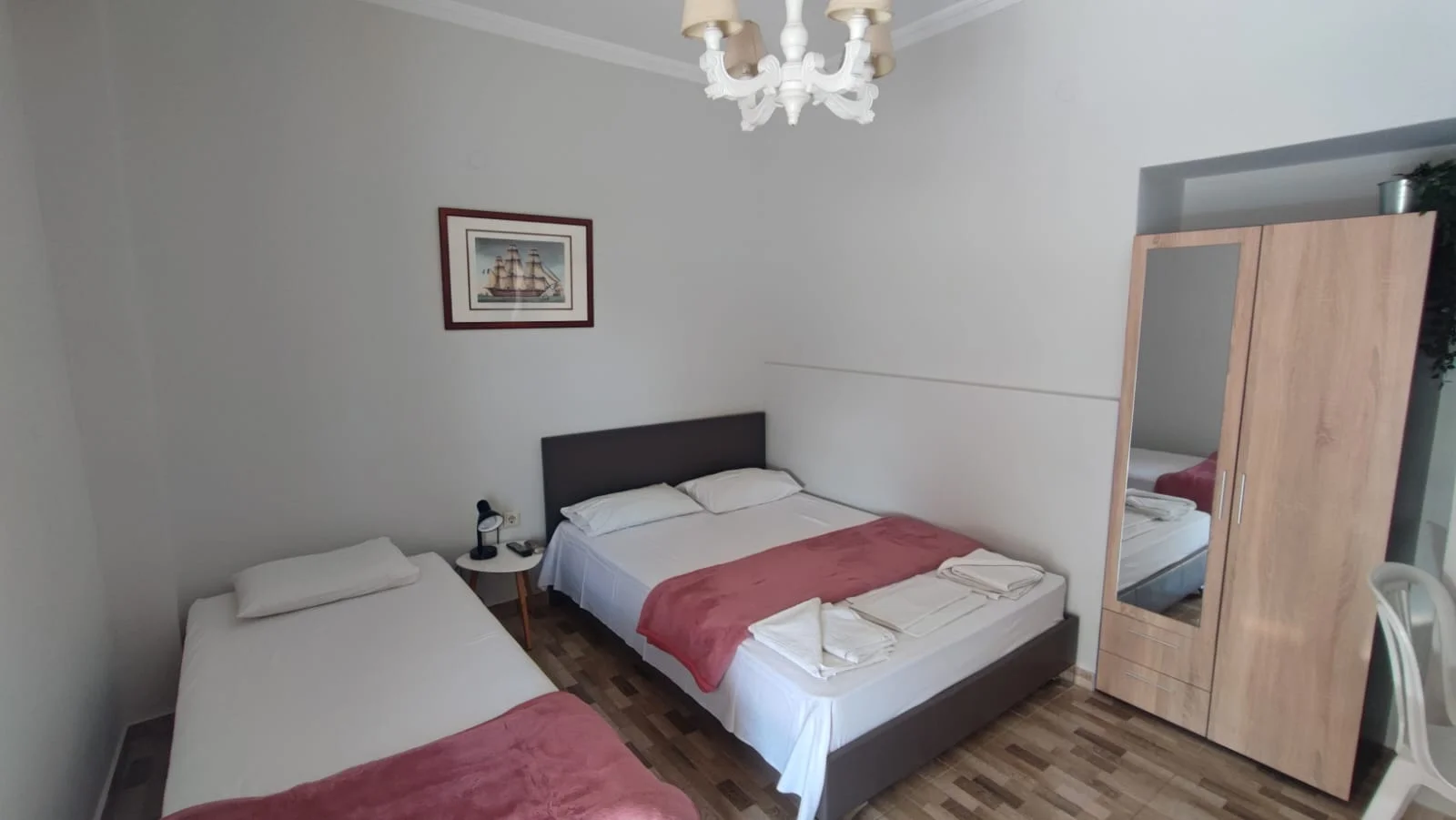 A room with 1 King Bed double (160cm x 200cm) and 1 single bed (90cm x 200cm). A space with kitchen. Private toilet. Airy apartment with a veranda terrace overlooking the sea.